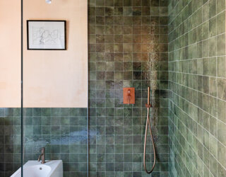 un bagno con doccia, le mattonelle color verde e la carta dei parati con pavoni.